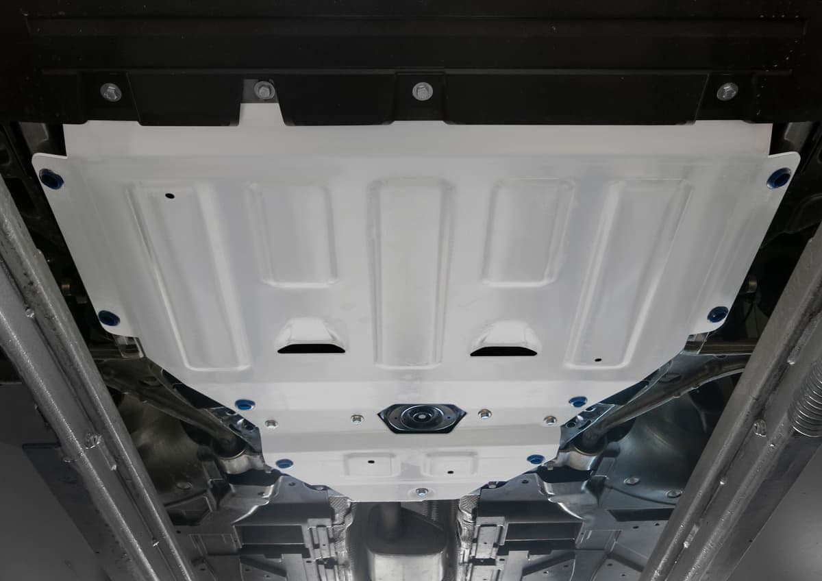 Стойкое порошковое окрашивание позволяет сохранить внешний вид, защитит от царапин, предотвратит коррозию. Также имеется утопленный крепеж для предотвращения срывов. Крепеж не образует с алюминием гальваническую пару. Защита спроектирована индивидуально для автомобиля, что позволяет устанавливать ее в штатные места без доработки кузова за 10 мин.