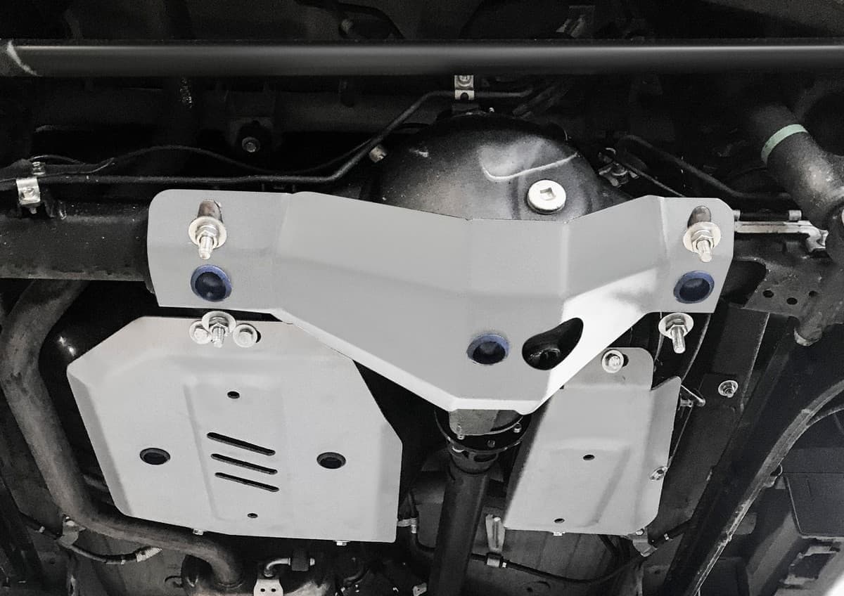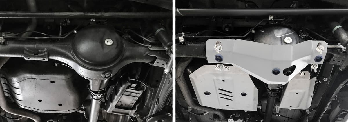 Стойкое порошковое окрашивание позволяет сохранить внешний вид, защитит от царапин, предотвратит коррозию. Также имеется утопленный крепеж для предотвращения срывов. Крепеж не образует с алюминием гальваническую пару. Защита спроектирована индивидуально для автомобиля, что позволяет устанавливать ее в штатные места без доработки кузова за 10 мин.