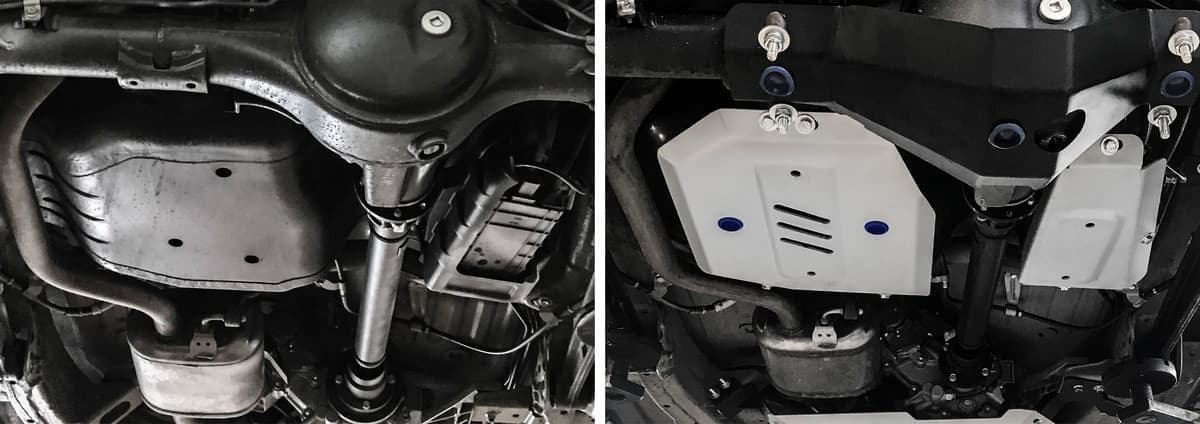 Стойкое порошковое окрашивание позволяет сохранить внешний вид, защитит от царапин, предотвратит коррозию. Также имеется утопленный крепеж для предотвращения срывов. Крепеж не образует с алюминием гальваническую пару. Защита спроектирована индивидуально для автомобиля, что позволяет устанавливать ее в штатные места без доработки кузова за 10 мин.