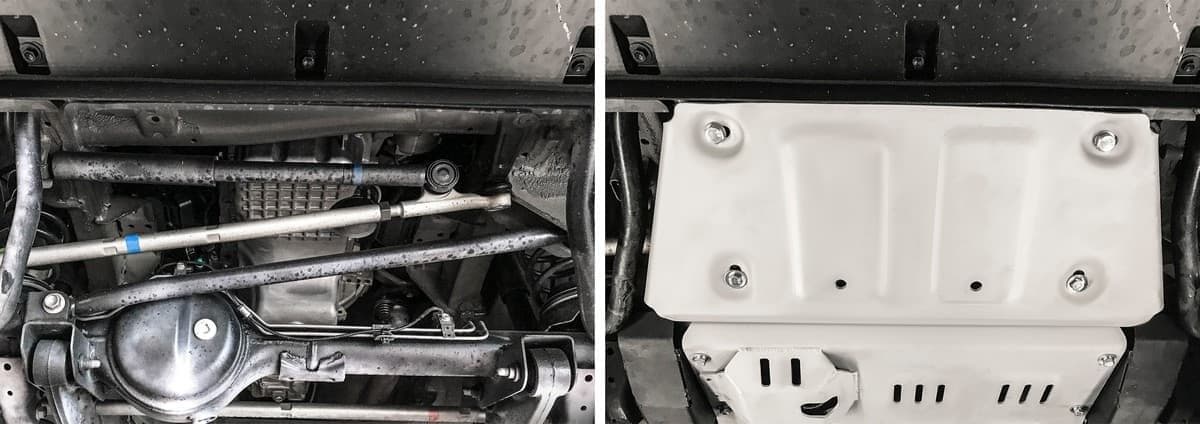 Стойкое порошковое окрашивание позволяет сохранить внешний вид, защитит от царапин, предотвратит коррозию. Также имеется утопленный крепеж для предотвращения срывов. Крепеж не образует с алюминием гальваническую пару. Защита спроектирована индивидуально для автомобиля, что позволяет устанавливать ее в штатные места без доработки кузова за 10 мин.
