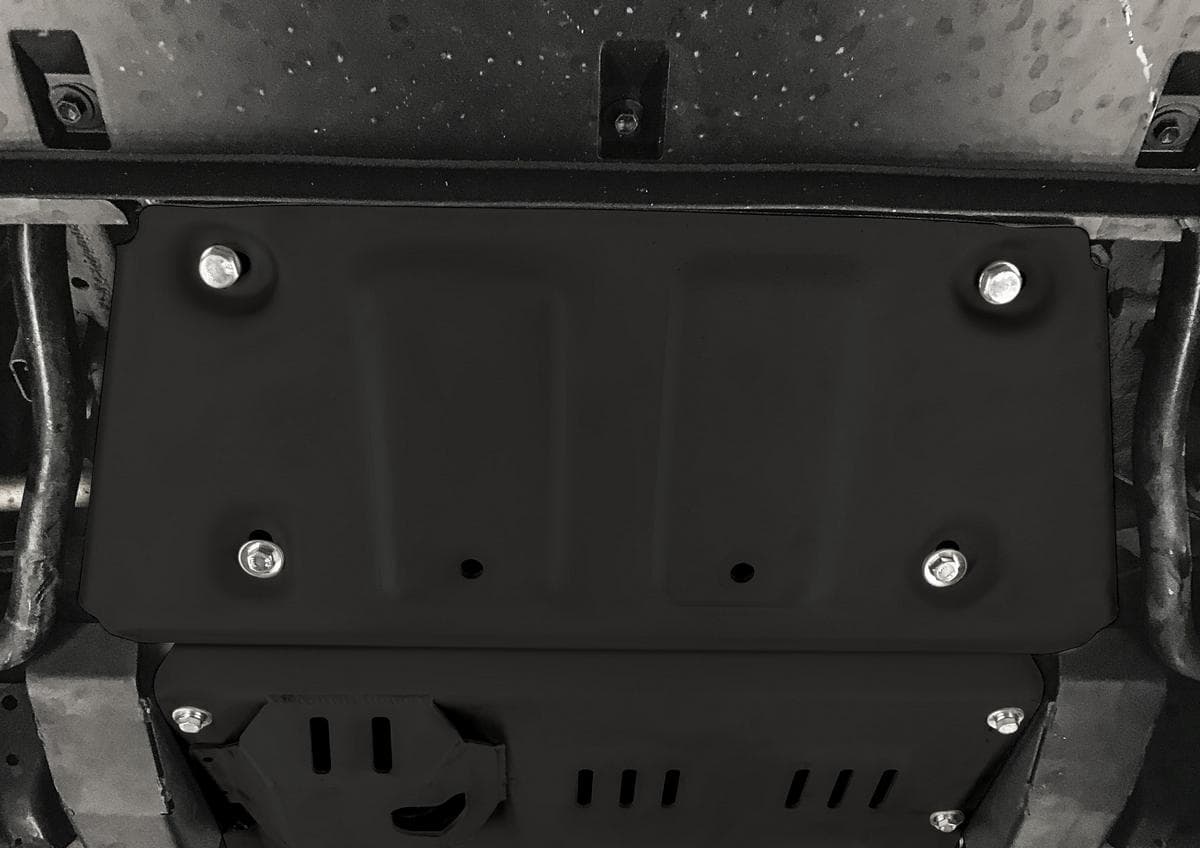 Порошковое окрашивание гарантирует долгий срок службы. А глубокий штамп увеличивает жесткость до 2,5 раз. Также имеется утопленный крепеж для предотвращения срывов. Качественная покраска защиты картера выдерживает 720 часов соляного тумана. Толщина изделия составляет 2-6 мм. Подштамповка в местах крепления предохраняет крепеж от срезания. Деталь спроектирована индивидуально для вашего автомобиля, что позволяет устанавливать ее в штатные места без доработки кузова за 10 мин.