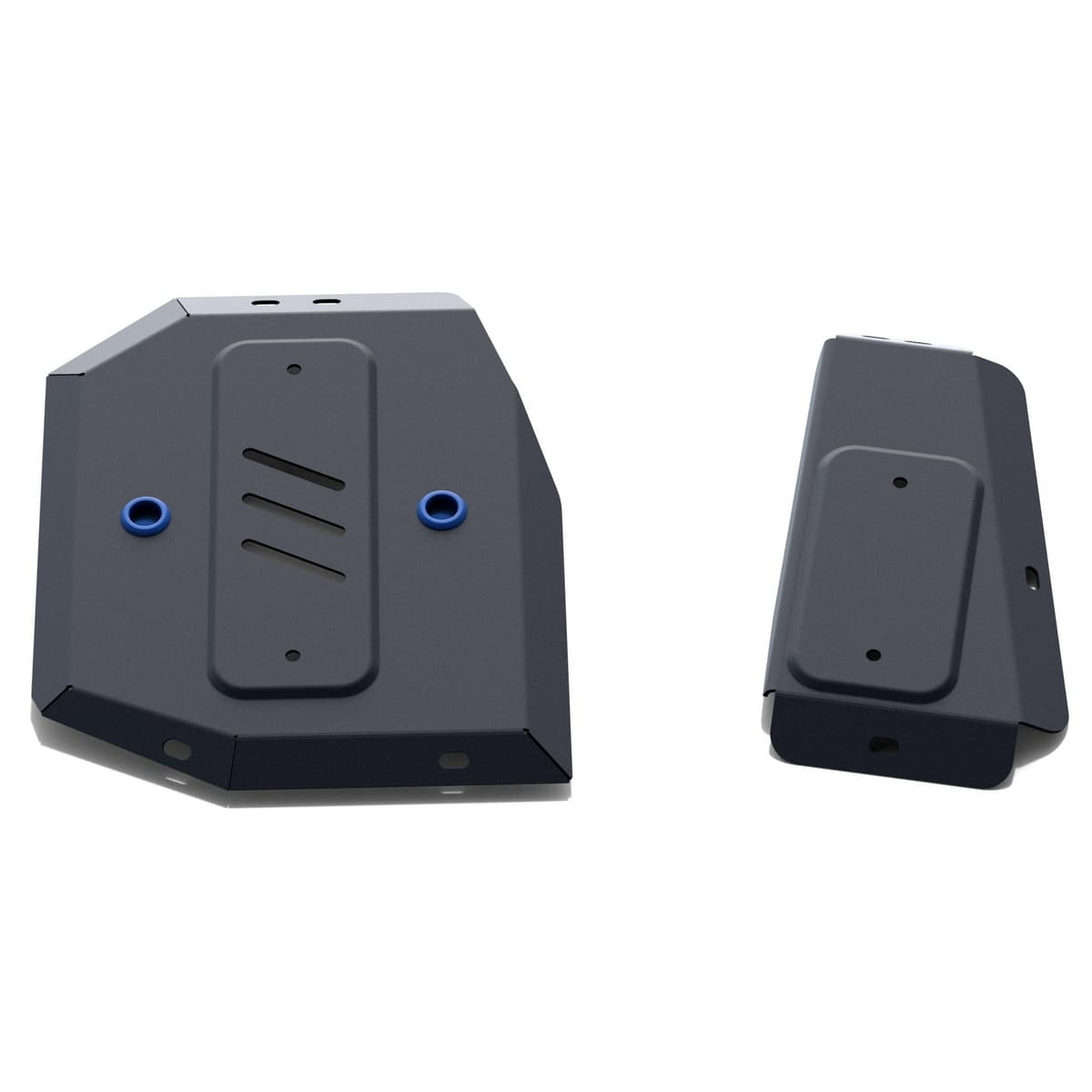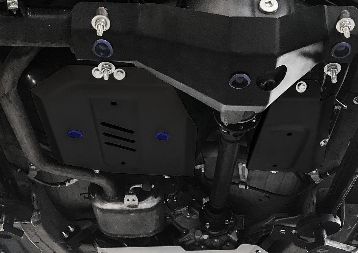 Порошковое окрашивание гарантирует долгий срок службы. А глубокий штамп увеличивает жесткость до 2,5 раз. Также имеется утопленный крепеж для предотвращения срывов. Качественная покраска защиты картера выдерживает 720 часов соляного тумана. Толщина изделия составляет 2-6 мм. Подштамповка в местах крепления предохраняет крепеж от срезания. Деталь спроектирована индивидуально для вашего автомобиля, что позволяет устанавливать ее в штатные места без доработки кузова за 10 мин.