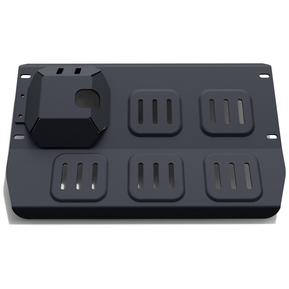 Порошковое окрашивание гарантирует долгий срок службы. А глубокий штамп увеличивает жесткость до 2,5 раз. Также имеется утопленный крепеж для предотвращения срывов. Качественная покраска защиты картера выдерживает 720 часов соляного тумана. Толщина изделия составляет 2-6 мм. Подштамповка в местах крепления предохраняет крепеж от срезания. Деталь спроектирована индивидуально для вашего автомобиля, что позволяет устанавливать ее в штатные места без доработки кузова за 10 мин.