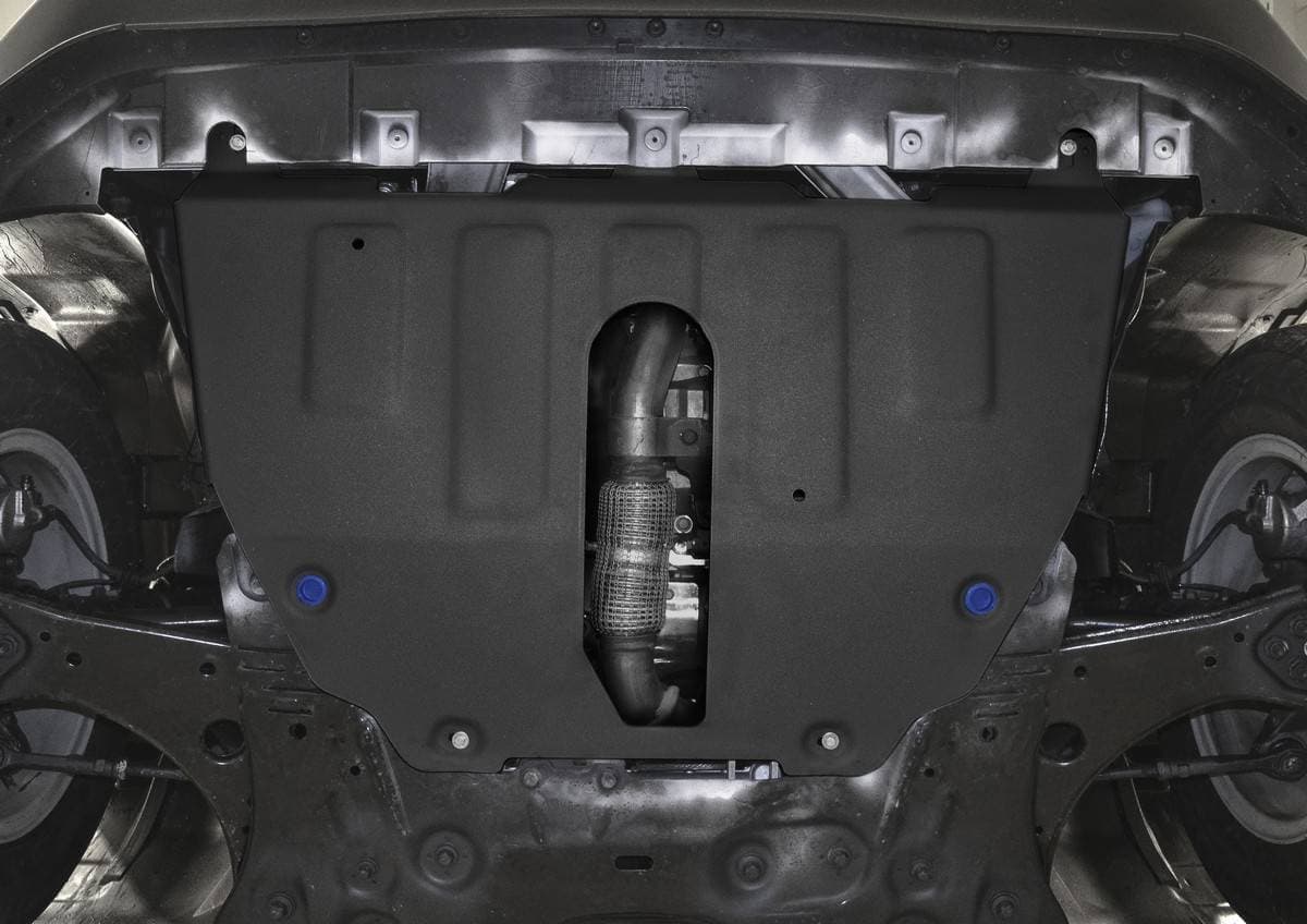 Порошковое окрашивание гарантирует долгий срок службы. А глубокий штамп увеличивает жесткость до 2,5 раз. Также имеется утопленный крепеж для предотвращения срывов. Качественная покраска защиты картера выдерживает 720 часов соляного тумана. Толщина изделия составляет 2-6 мм. Подштамповка в местах крепления предохраняет крепеж от срезания. Деталь спроектирована индивидуально для вашего автомобиля, что позволяет устанавливать ее в штатные места без доработки кузова за 10 мин.