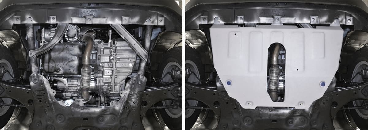 Стойкое порошковое окрашивание позволяет сохранить внешний вид, защитит от царапин, предотвратит коррозию. Также имеется утопленный крепеж для предотвращения срывов. Крепеж не образует с алюминием гальваническую пару. Защита спроектирована индивидуально для автомобиля, что позволяет устанавливать ее в штатные места без доработки кузова за 10 мин.