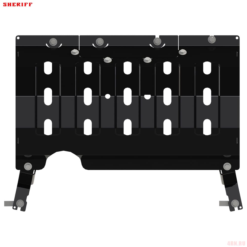 Защита картера Sheriff нужна для сохранности узлов и агрегатов, находящихся на днище авто. Она надежно защитит двигательный отсек вашей машины от повреждений. Также она защищает моторный отсек от влаги, грязи, и предусматривает наличие металлических крыльев, которые выполняют функцию пыльника.