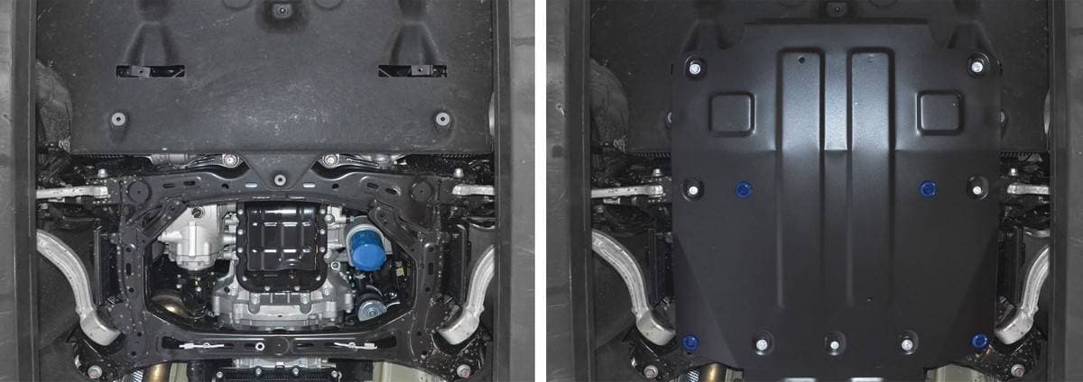 Порошковое окрашивание гарантирует долгий срок службы. А глубокий штамп увеличивает жесткость до 2,5 раз. Также имеется утопленный крепеж для предотвращения срывов. Качественная покраска защиты картера выдерживает 720 часов соляного тумана. Толщина изделия составляет 2-6 мм. Подштамповка в местах крепления предохраняет крепеж от срезания. Деталь спроектирована индивидуально для вашего автомобиля, что позволяет устанавливать ее в штатные места без доработки кузова за 10 мин.