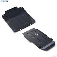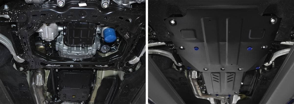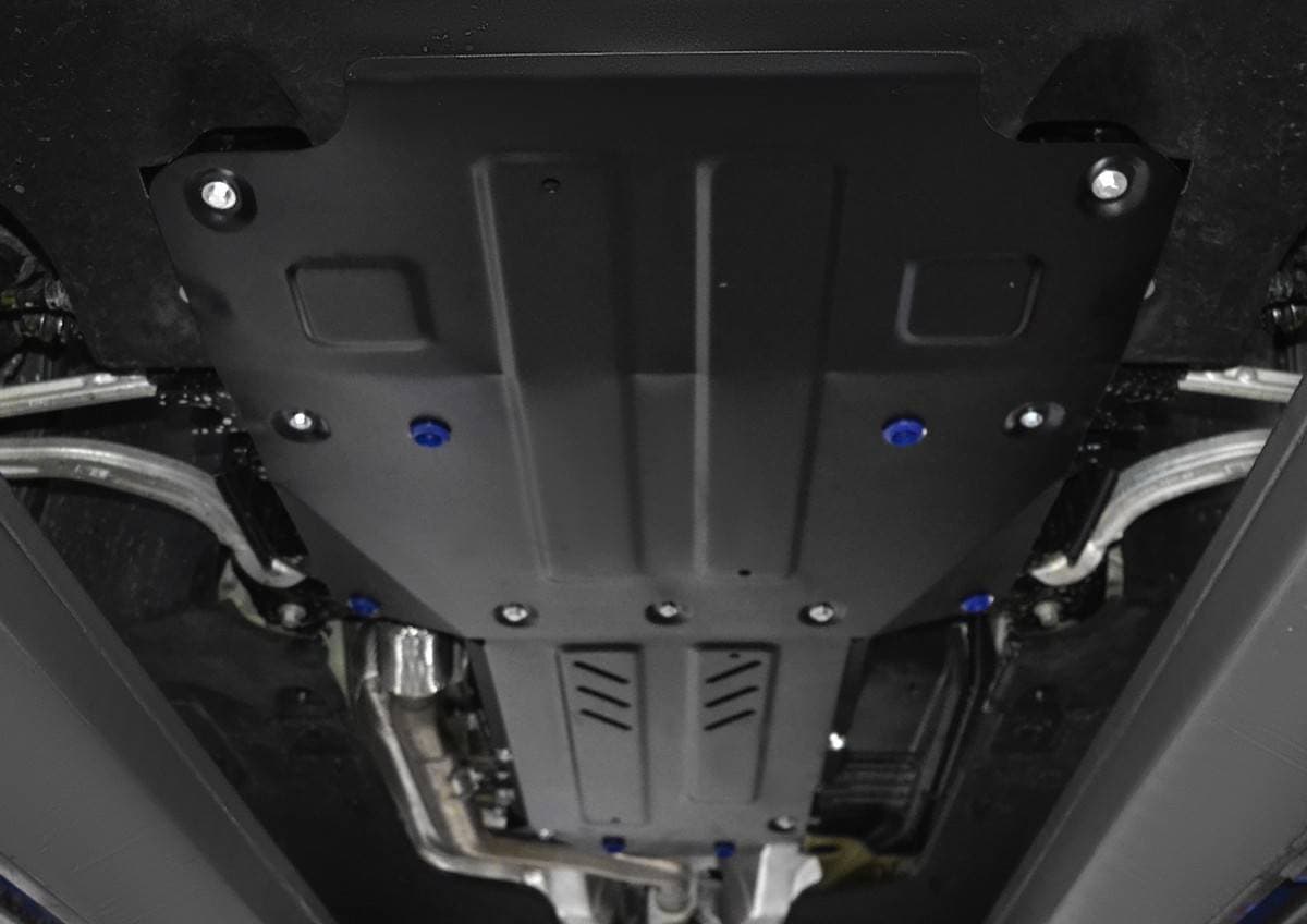 Порошковое окрашивание гарантирует долгий срок службы. А глубокий штамп увеличивает жесткость до 2,5 раз. Также имеется утопленный крепеж для предотвращения срывов. Качественная покраска защиты картера выдерживает 720 часов соляного тумана. Толщина изделия составляет 2-6 мм. Подштамповка в местах крепления предохраняет крепеж от срезания. Деталь спроектирована индивидуально для вашего автомобиля, что позволяет устанавливать ее в штатные места без доработки кузова за 10 мин.