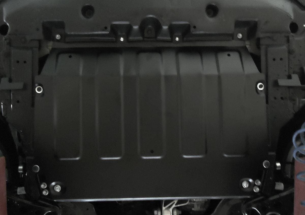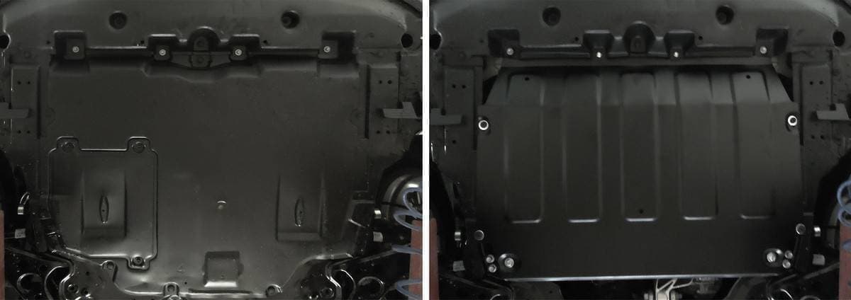 Порошковое окрашивание гарантирует долгий срок службы. А глубокий штамп увеличивает жесткость до 2,5 раз. Также имеется утопленный крепеж для предотвращения срывов. Качественная покраска защиты картера выдерживает 720 часов соляного тумана. Толщина изделия составляет 2-6 мм. Подштамповка в местах крепления предохраняет крепеж от срезания. Деталь спроектирована индивидуально для вашего автомобиля, что позволяет устанавливать ее в штатные места без доработки кузова за 10 мин.
