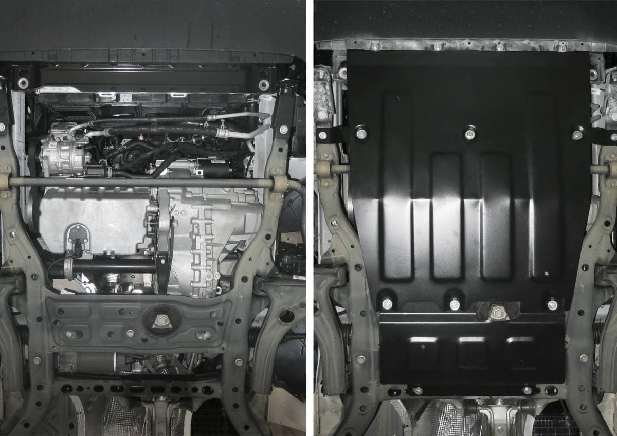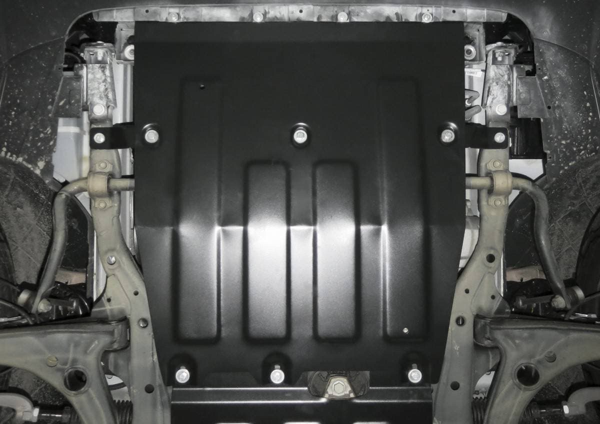 Порошковое окрашивание гарантирует долгий срок службы. А глубокий штамп увеличивает жесткость до 2,5 раз. Также имеется утопленный крепеж для предотвращения срывов. Качественная покраска защиты картера выдерживает 720 часов соляного тумана. Толщина изделия составляет 2-6 мм. Подштамповка в местах крепления предохраняет крепеж от срезания. Деталь спроектирована индивидуально для вашего автомобиля, что позволяет устанавливать ее в штатные места без доработки кузова за 10 мин.
