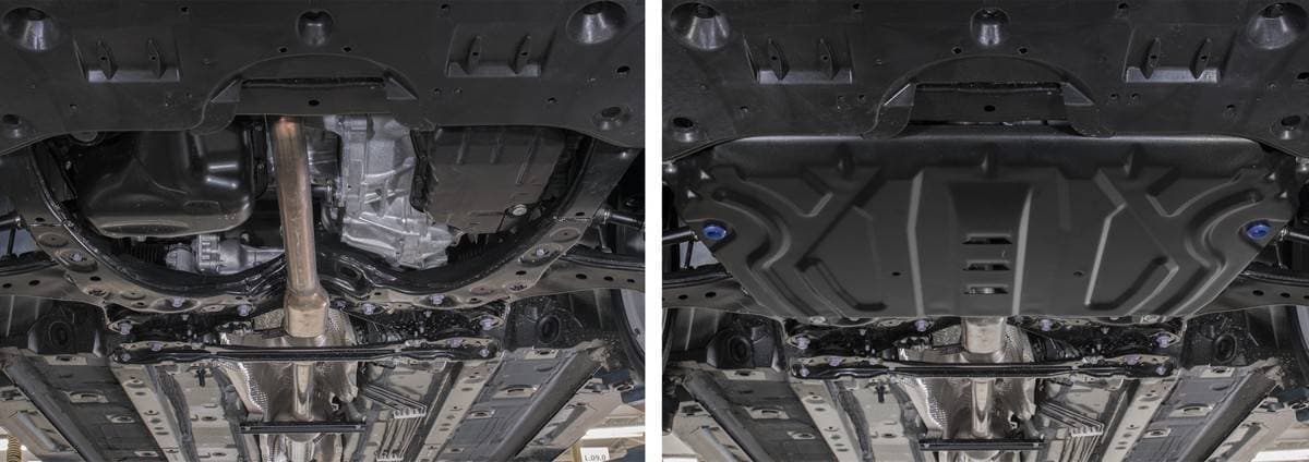 Порошковое окрашивание гарантирует долгий срок службы. А глубокий штамп увеличивает жесткость до 2,5 раз. Также имеется утопленный крепеж для предотвращения срывов. Качественная покраска защиты картера выдерживает 720 часов соляного тумана. Толщина изделия составляет 2-6 мм. Подштамповка в местах крепления предохраняет крепеж от срезания. Деталь спроектирована индивидуально для вашего автомобиля, что позволяет устанавливать ее в штатные места без доработки кузова за 10 мин.