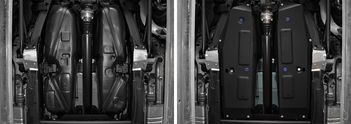 Стойкое порошковое окрашивание позволяет сохранить внешний вид, защитит от царапин, предотвратит коррозию. Также имеется утопленный крепеж для предотвращения срывов. Крепеж не образует с алюминием гальваническую пару. Защита спроектирована индивидуально для автомобиля, что позволяет устанавливать ее в штатные места без доработки кузова за 10 мин.
