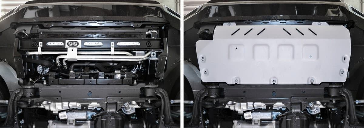 Стойкое порошковое окрашивание позволяет сохранить внешний вид, защитит от царапин, предотвратит коррозию. Также имеется утопленный крепеж для предотвращения срывов. Крепеж не образует с алюминием гальваническую пару. Защита спроектирована индивидуально для автомобиля, что позволяет устанавливать ее в штатные места без доработки кузова за 10 мин.