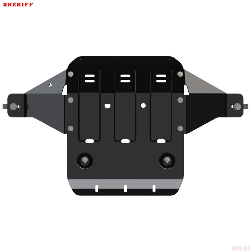 Защита картера Sheriff нужна для сохранности узлов и агрегатов, находящихся на днище авто. Она надежно защитит двигательный отсек вашей машины от повреждений. Также она защищает моторный отсек от влаги, грязи, и предусматривает наличие металлических крыльев, которые выполняют функцию пыльника.