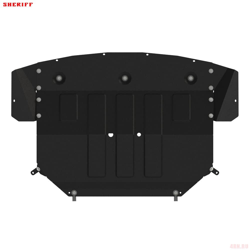 Защита картера Sheriff нужна для сохранности узлов и агрегатов, находящихся на днище авто. Она надежно защитит двигательный отсек вашей машины от повреждений. Также она защищает моторный отсек от влаги, грязи, и предусматривает наличие металлических крыльев, которые выполняют функцию пыльника.
