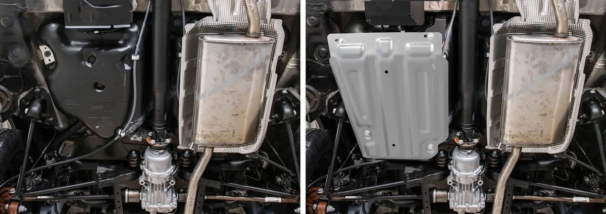 Стойкое порошковое окрашивание позволяет сохранить внешний вид, защитит от царапин, предотвратит коррозию. Также имеется утопленный крепеж для предотвращения срывов. Крепеж не образует с алюминием гальваническую пару. Защита спроектирована индивидуально для автомобиля, что позволяет устанавливать ее в штатные места без доработки кузова за 10 мин.