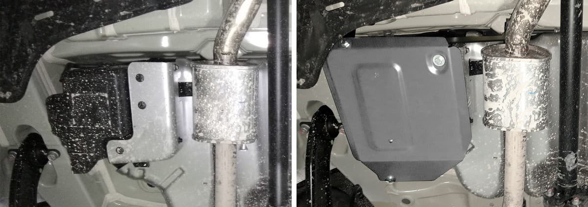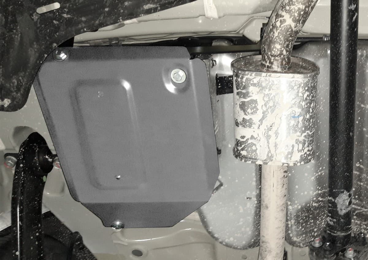 Стойкое порошковое окрашивание позволяет сохранить внешний вид, защитит от царапин, предотвратит коррозию. Также имеется утопленный крепеж для предотвращения срывов. Крепеж не образует с алюминием гальваническую пару. Защита спроектирована индивидуально для автомобиля, что позволяет устанавливать ее в штатные места без доработки кузова за 10 мин.