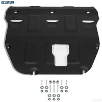 Порошковое окрашивание гарантирует долгий срок службы. А глубокий штамп увеличивает жесткость до 2,5 раз. Также имеется утопленный крепеж для предотвращения срывов. Качественная покраска защиты картера выдерживает 720 часов соляного тумана. Толщина изделия составляет 2-6 мм. Подштамповка в местах крепления предохраняет крепеж от срезания. Деталь спроектирована индивидуально для вашего автомобиля, что позволяет устанавливать ее в штатные места без доработки кузова за 10 мин.
