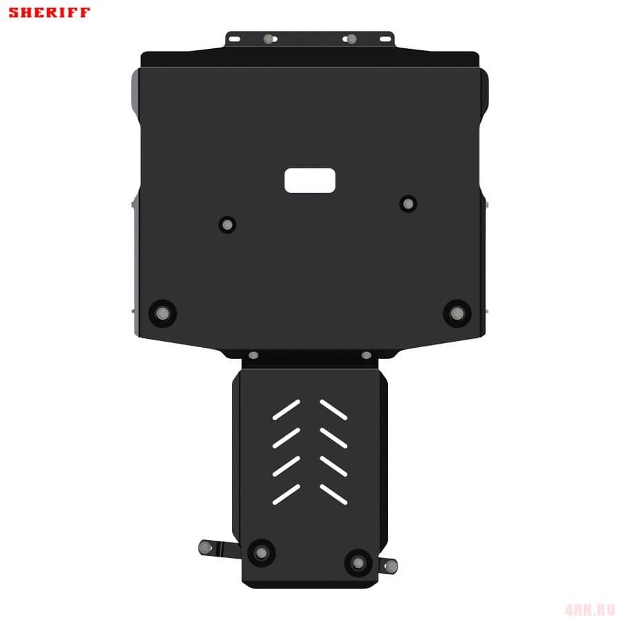 Защита картера Sheriff нужна для сохранности узлов и агрегатов, находящихся на днище авто. Она надежно защитит двигательный отсек вашей машины от повреждений. Также она защищает моторный отсек от влаги, грязи, и предусматривает наличие металлических крыльев, которые выполняют функцию пыльника.