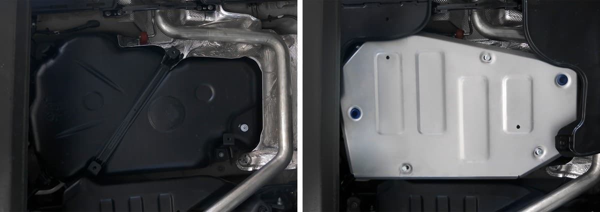 Стойкое порошковое окрашивание позволяет сохранить внешний вид, защитит от царапин, предотвратит коррозию. Также имеется утопленный крепеж для предотвращения срывов. Крепеж не образует с алюминием гальваническую пару. Защита спроектирована индивидуально для автомобиля, что позволяет устанавливать ее в штатные места без доработки кузова за 10 мин.