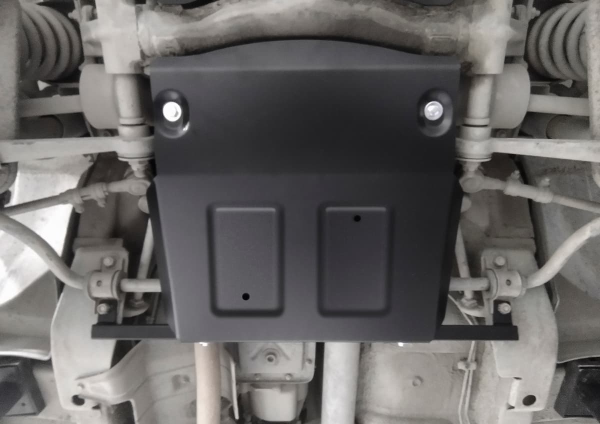Порошковое окрашивание гарантирует долгий срок службы. А глубокий штамп увеличивает жесткость до 2,5 раз. Также имеется утопленный крепеж для предотвращения срывов. Качественная покраска защиты картера выдерживает 720 часов соляного тумана. Толщина изделия составляет 2-6 мм. Подштамповка в местах крепления предохраняет крепеж от срезания. Деталь спроектирована индивидуально для вашего автомобиля, что позволяет устанавливать ее в штатные места без доработки кузова за 10 мин.