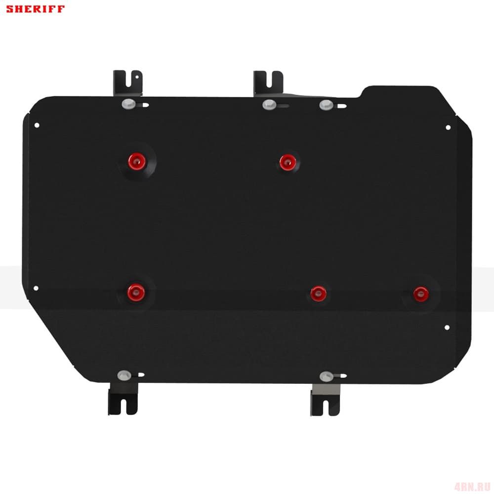 Защита картера Sheriff нужна для сохранности узлов и агрегатов, находящихся на днище авто. Она надежно защитит двигательный отсек вашей машины от повреждений. Также она защищает моторный отсек от влаги, грязи, и предусматривает наличие металлических крыльев, которые выполняют функцию пыльника.