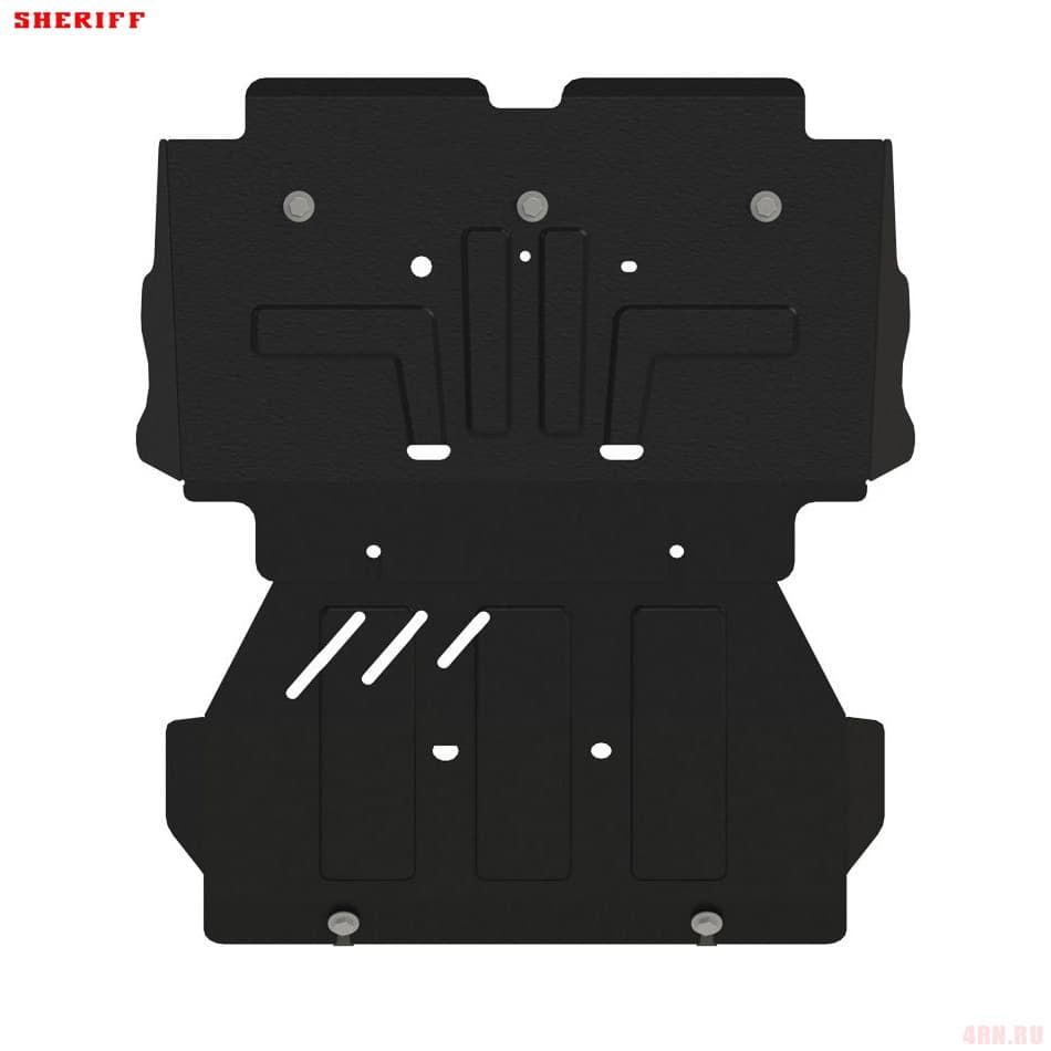 Защита картера Sheriff нужна для сохранности узлов и агрегатов, находящихся на днище авто. Она надежно защитит двигательный отсек вашей машины от повреждений. Также она защищает моторный отсек от влаги, грязи, и предусматривает наличие металлических крыльев, которые выполняют функцию пыльника.