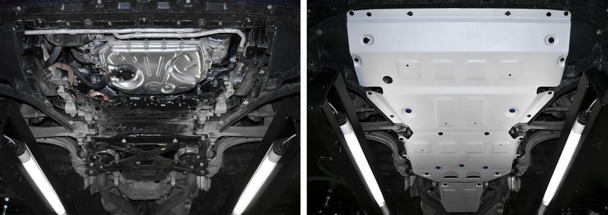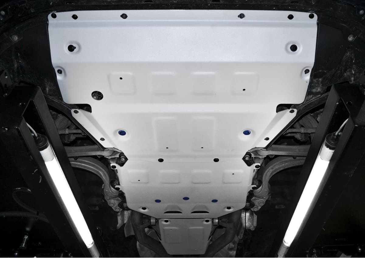 Стойкое порошковое окрашивание позволяет сохранить внешний вид, защитит от царапин, предотвратит коррозию. Также имеется утопленный крепеж для предотвращения срывов. Крепеж не образует с алюминием гальваническую пару. Защита спроектирована индивидуально для автомобиля, что позволяет устанавливать ее в штатные места без доработки кузова за 10 мин.