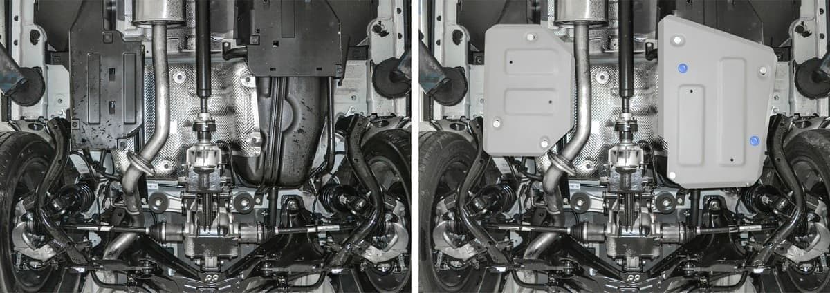 Стойкое порошковое окрашивание позволяет сохранить внешний вид, защитит от царапин, предотвратит коррозию. Также имеется утопленный крепеж для предотвращения срывов. Крепеж не образует с алюминием гальваническую пару. Защита спроектирована индивидуально для автомобиля, что позволяет устанавливать ее в штатные места без доработки кузова за 10 мин.