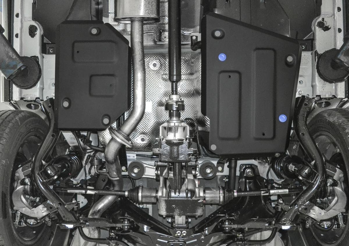 Порошковое окрашивание гарантирует долгий срок службы. А глубокий штамп увеличивает жесткость до 2,5 раз. Также имеется утопленный крепеж для предотвращения срывов. Качественная покраска защиты картера выдерживает 720 часов соляного тумана. Толщина изделия составляет 2-6 мм. Подштамповка в местах крепления предохраняет крепеж от срезания. Деталь спроектирована индивидуально для вашего автомобиля, что позволяет устанавливать ее в штатные места без доработки кузова за 10 мин.