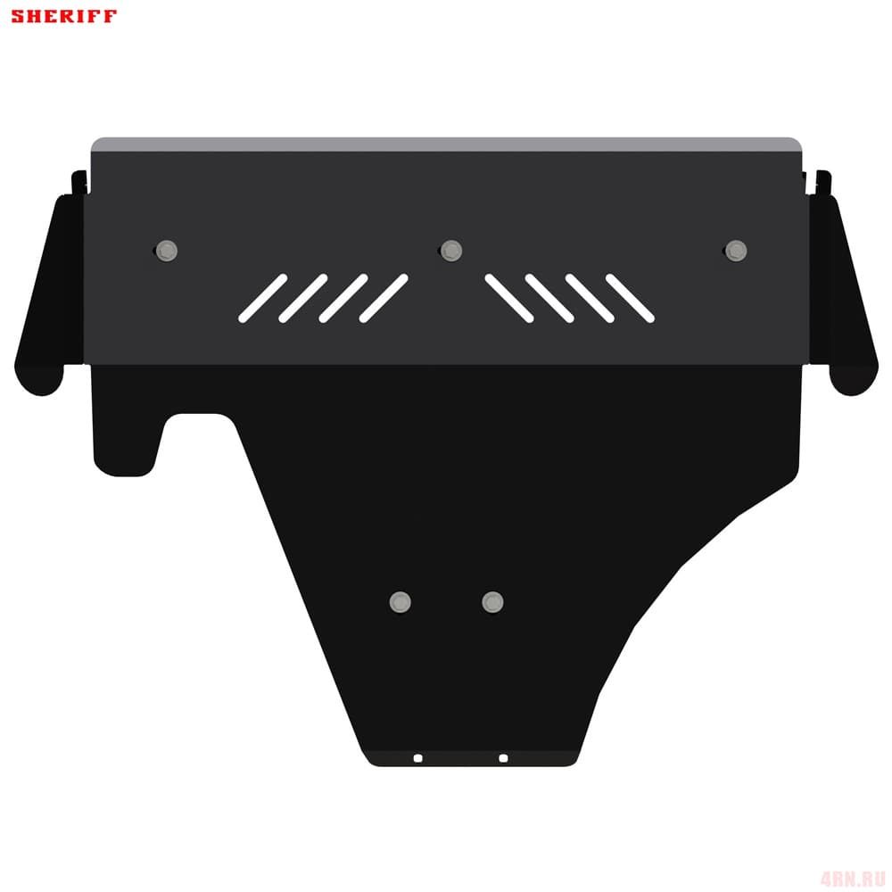 Защита картера Sheriff нужна для сохранности узлов и агрегатов, находящихся на днище авто. Она надежно защитит двигательный отсек вашей машины от повреждений. Также она защищает моторный отсек от влаги, грязи, и предусматривает наличие металлических крыльев, которые выполняют функцию пыльника.