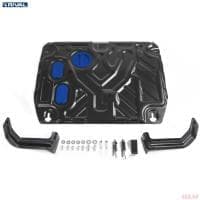 Порошковое окрашивание гарантирует долгий срок службы. А глубокий штамп увеличивает жесткость до 2,5 раз. Также имеется утопленный крепеж для предотвращения срывов. Качественная покраска защиты картера выдерживает 720 часов соляного тумана. Толщина изделия составляет 2-6 мм. Подштамповка в местах крепления предохраняет крепеж от срезания. Деталь спроектирована индивидуально для вашего автомобиля, что позволяет устанавливать ее в штатные места без доработки кузова за 10 мин.