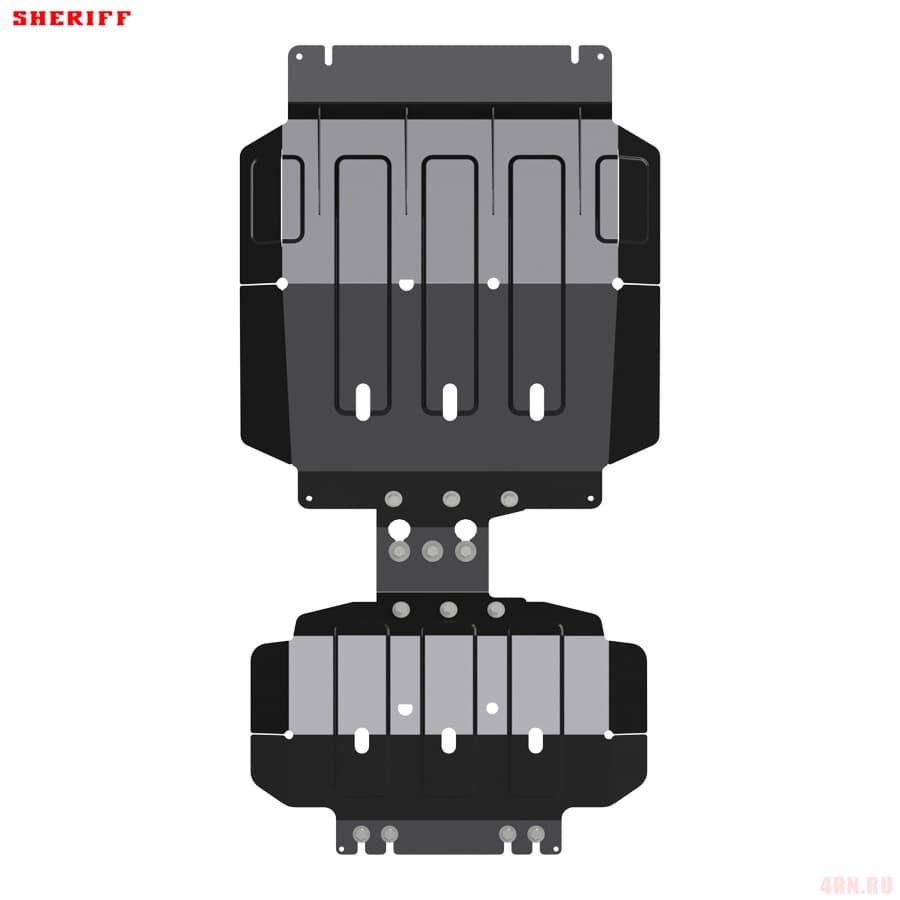 Защита картера Sheriff нужна для сохранности узлов и агрегатов, находящихся на днище авто. Она надежно защитит двигательный отсек вашей машины от повреждений. Также она защищает моторный отсек от влаги, грязи, и предусматривает наличие металлических крыльев, которые выполняют функцию пыльника.