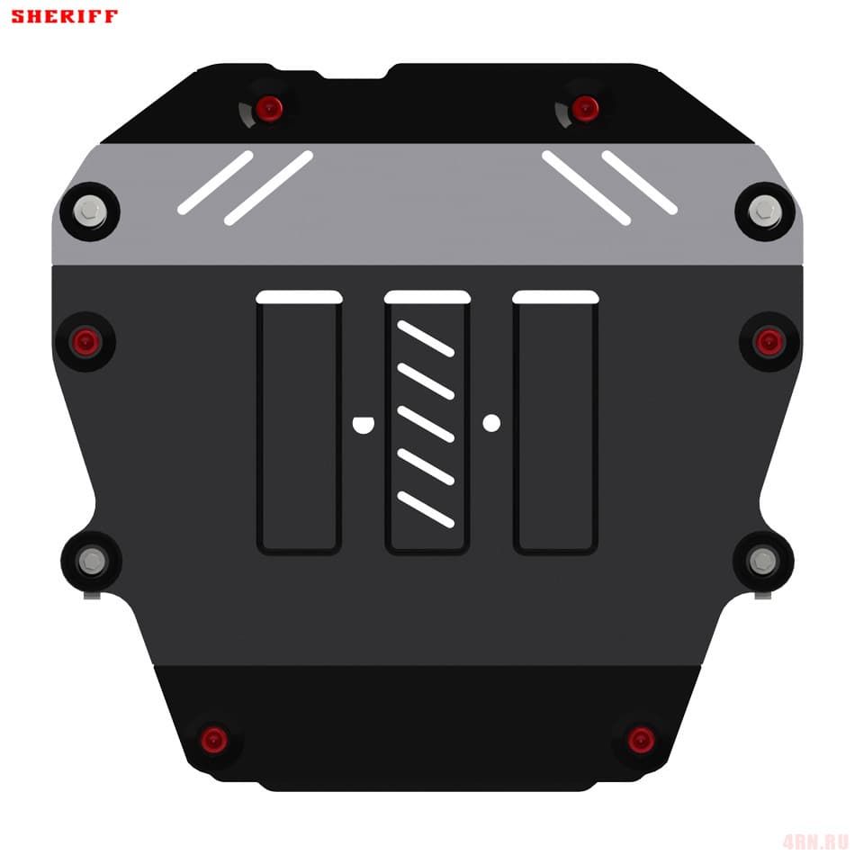 Защита картера Sheriff нужна для сохранности узлов и агрегатов, находящихся на днище авто. Она надежно защитит двигательный отсек вашей машины от повреждений. Также она защищает моторный отсек от влаги, грязи, и предусматривает наличие металлических крыльев, которые выполняют функцию пыльника.