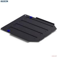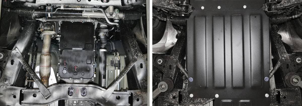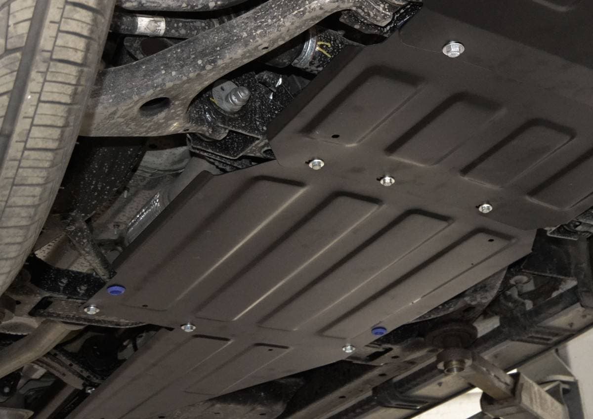 Порошковое окрашивание гарантирует долгий срок службы. А глубокий штамп увеличивает жесткость до 2,5 раз. Также имеется утопленный крепеж для предотвращения срывов. Качественная покраска защиты картера выдерживает 720 часов соляного тумана. Толщина изделия составляет 2-6 мм. Подштамповка в местах крепления предохраняет крепеж от срезания. Деталь спроектирована индивидуально для вашего автомобиля, что позволяет устанавливать ее в штатные места без доработки кузова за 10 мин.