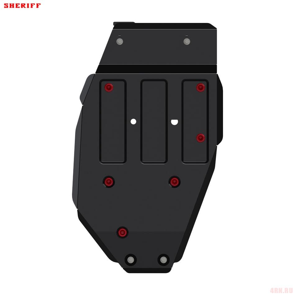 Защита картера Sheriff нужна для сохранности узлов и агрегатов, находящихся на днище авто. Она надежно защитит двигательный отсек вашей машины от повреждений. Также она защищает моторный отсек от влаги, грязи, и предусматривает наличие металлических крыльев, которые выполняют функцию пыльника.