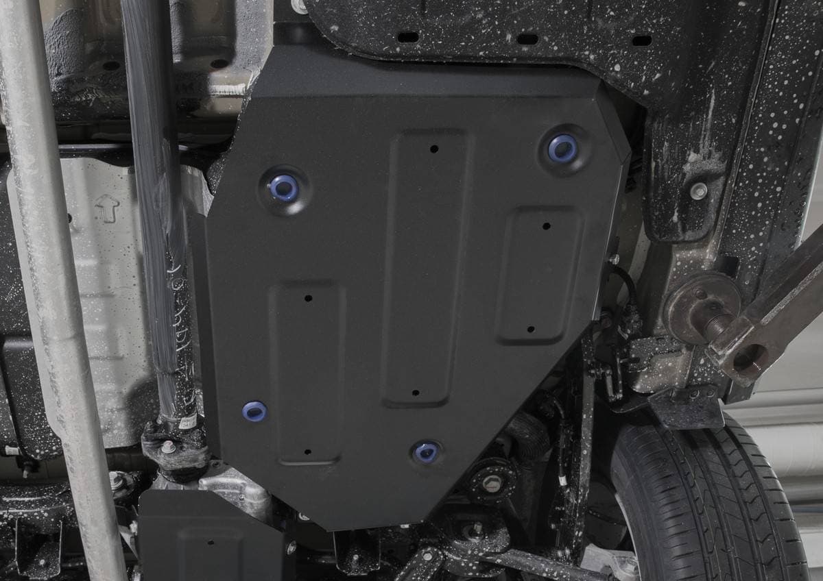 Порошковое окрашивание гарантирует долгий срок службы. А глубокий штамп увеличивает жесткость до 2,5 раз. Также имеется утопленный крепеж для предотвращения срывов. Качественная покраска защиты картера выдерживает 720 часов соляного тумана. Толщина изделия составляет 2-6 мм. Подштамповка в местах крепления предохраняет крепеж от срезания. Деталь спроектирована индивидуально для вашего автомобиля, что позволяет устанавливать ее в штатные места без доработки кузова за 10 мин.