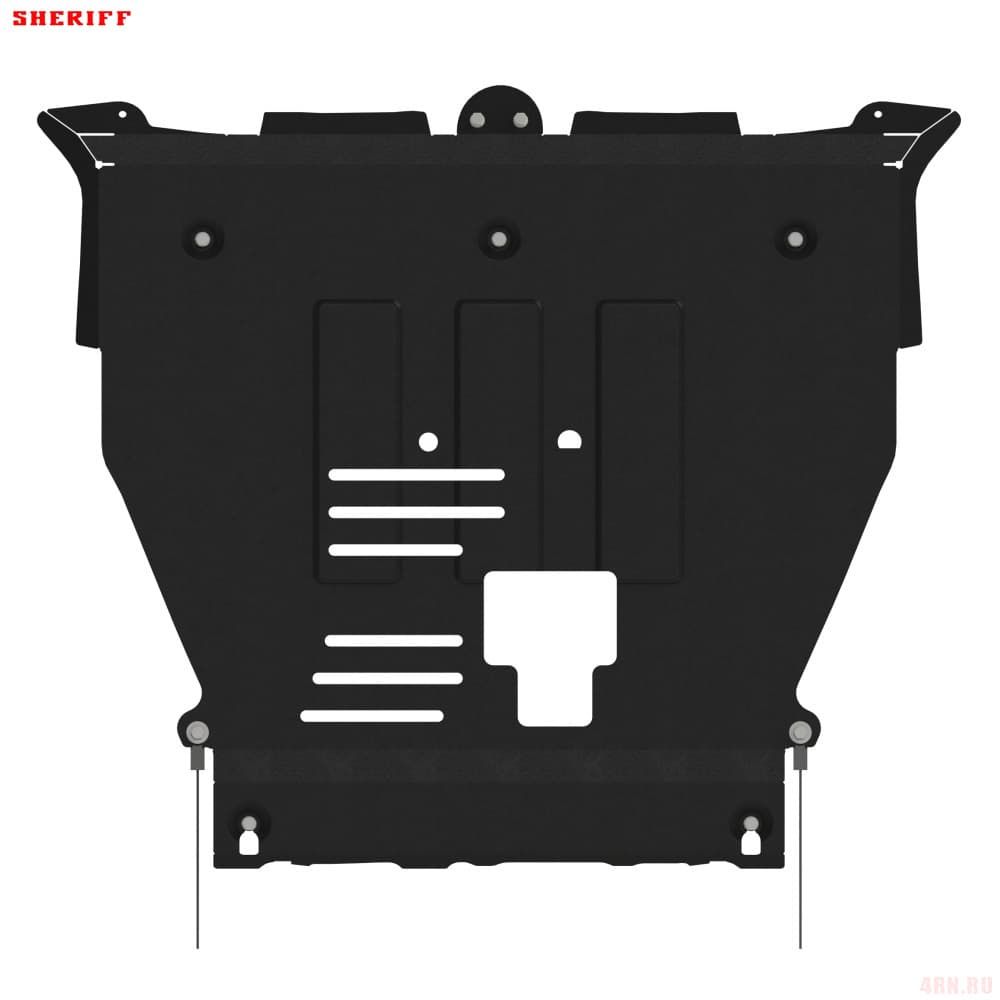 Защита картера Sheriff нужна для сохранности узлов и агрегатов, находящихся на днище авто. Она надежно защитит двигательный отсек вашей машины от повреждений. Также она защищает моторный отсек от влаги, грязи, и предусматривает наличие металлических крыльев, которые выполняют функцию пыльника.