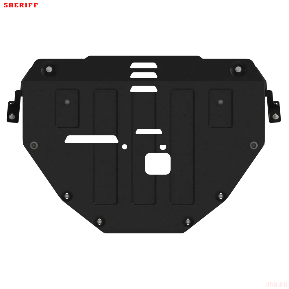 Защита картера Sheriff нужна для сохранности узлов и агрегатов, находящихся на днище авто. Она надежно защитит двигательный отсек вашей машины от повреждений. Также она защищает моторный отсек от влаги, грязи, и предусматривает наличие металлических крыльев, которые выполняют функцию пыльника.