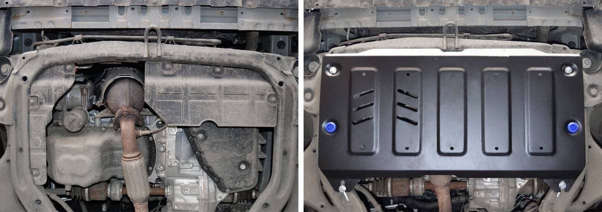 Порошковое окрашивание гарантирует долгий срок службы. А глубокий штамп увеличивает жесткость до 2,5 раз. Также имеется утопленный крепеж для предотвращения срывов. Качественная покраска защиты картера выдерживает 720 часов соляного тумана. Толщина изделия составляет 2-6 мм. Подштамповка в местах крепления предохраняет крепеж от срезания. Деталь спроектирована индивидуально для вашего автомобиля, что позволяет устанавливать ее в штатные места без доработки кузова за 10 мин.