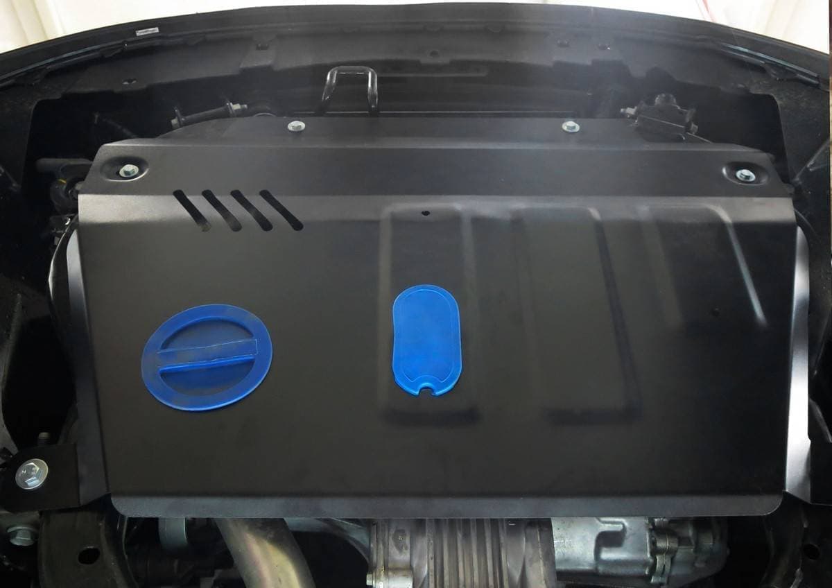 Порошковое окрашивание гарантирует долгий срок службы. А глубокий штамп увеличивает жесткость до 2,5 раз. Также имеется утопленный крепеж для предотвращения срывов. Качественная покраска защиты картера выдерживает 720 часов соляного тумана. Толщина изделия составляет 2-6 мм. Подштамповка в местах крепления предохраняет крепеж от срезания. Деталь спроектирована индивидуально для вашего автомобиля, что позволяет устанавливать ее в штатные места без доработки кузова за 10 мин.