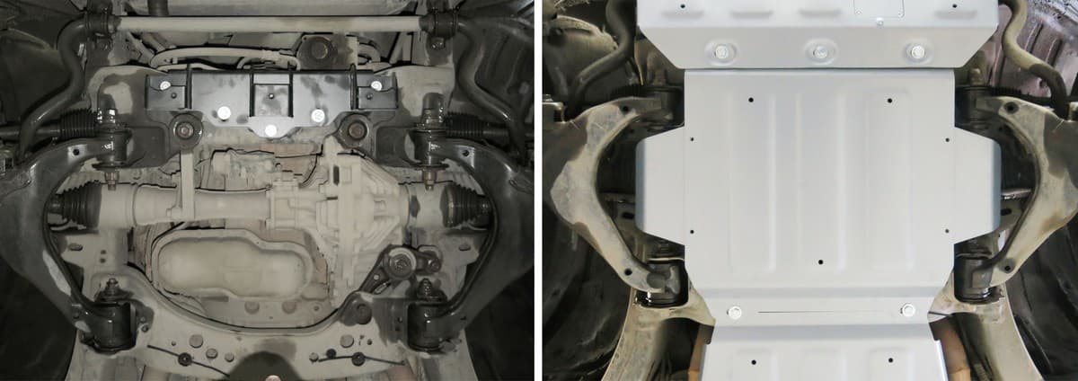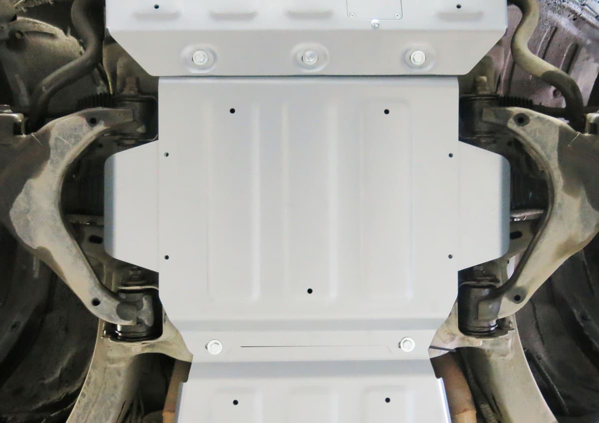 Стойкое порошковое окрашивание позволяет сохранить внешний вид, защитит от царапин, предотвратит коррозию. Также имеется утопленный крепеж для предотвращения срывов. Крепеж не образует с алюминием гальваническую пару. Защита спроектирована индивидуально для автомобиля, что позволяет устанавливать ее в штатные места без доработки кузова за 10 мин.