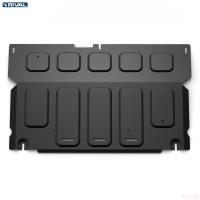 Порошковое окрашивание гарантирует долгий срок службы. А глубокий штамп увеличивает жесткость до 2,5 раз. Также имеется утопленный крепеж для предотвращения срывов. Качественная покраска защиты картера выдерживает 720 часов соляного тумана. Толщина изделия составляет 2-6 мм. Подштамповка в местах крепления предохраняет крепеж от срезания. Деталь спроектирована индивидуально для вашего автомобиля, что позволяет устанавливать ее в штатные места без доработки кузова за 10 мин.