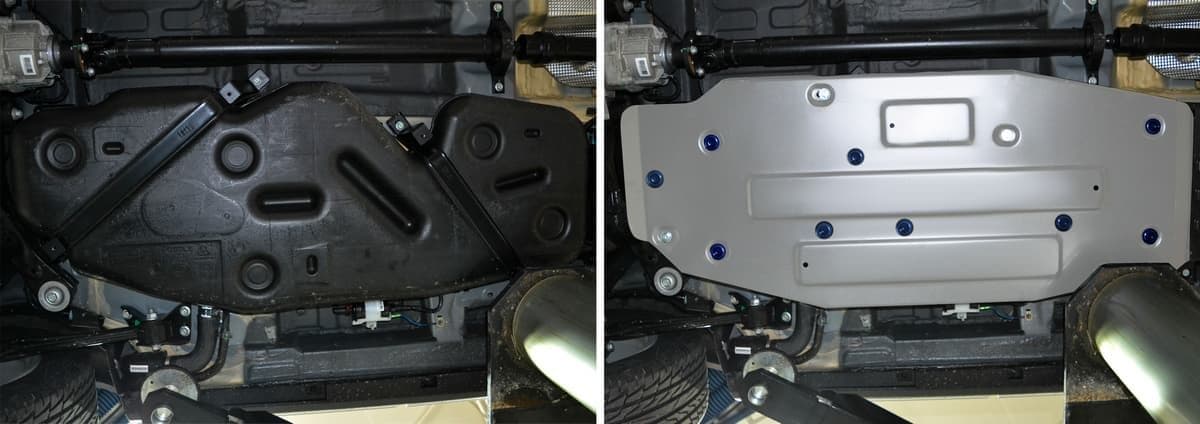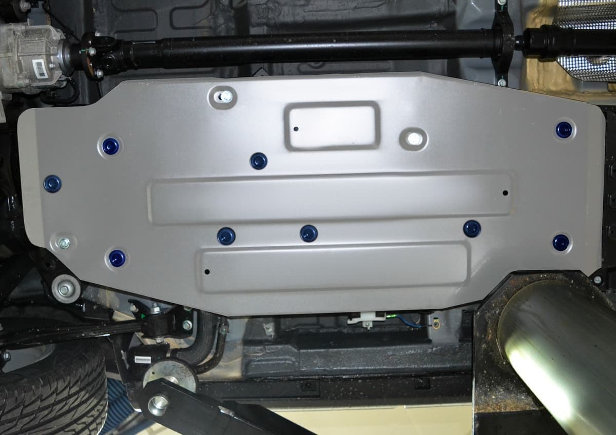 Стойкое порошковое окрашивание позволяет сохранить внешний вид, защитит от царапин, предотвратит коррозию. Также имеется утопленный крепеж для предотвращения срывов. Крепеж не образует с алюминием гальваническую пару. Защита спроектирована индивидуально для автомобиля, что позволяет устанавливать ее в штатные места без доработки кузова за 10 мин.