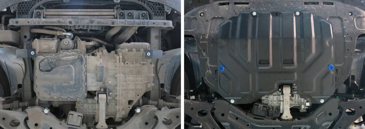Порошковое окрашивание гарантирует долгий срок службы. А глубокий штамп увеличивает жесткость до 2,5 раз. Также имеется утопленный крепеж для предотвращения срывов. Качественная покраска защиты картера выдерживает 720 часов соляного тумана. Толщина изделия составляет 2-6 мм. Подштамповка в местах крепления предохраняет крепеж от срезания. Деталь спроектирована индивидуально для вашего автомобиля, что позволяет устанавливать ее в штатные места без доработки кузова за 10 мин.