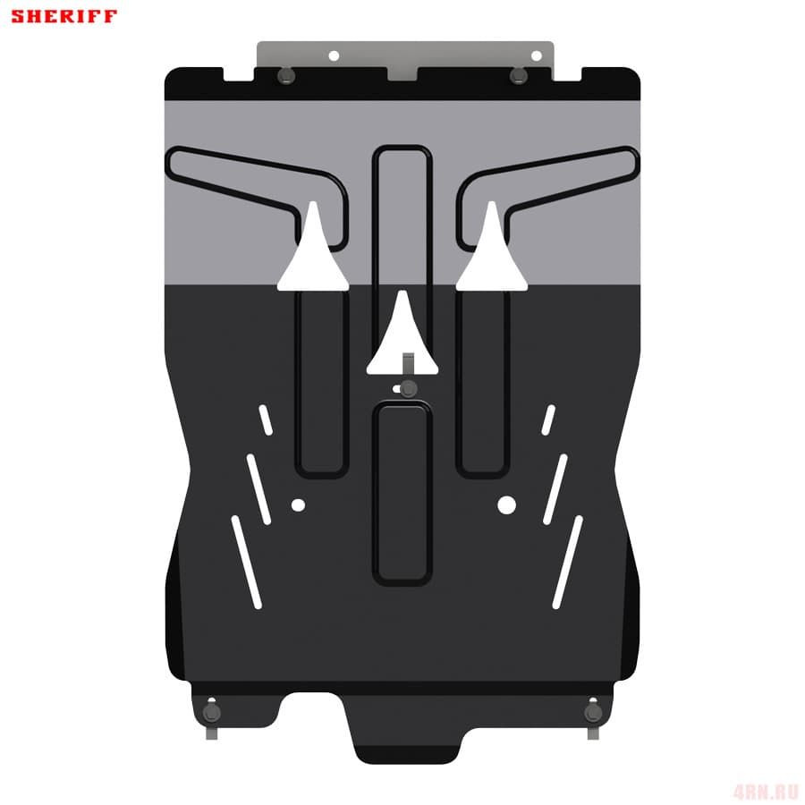 Защита картера Sheriff нужна для сохранности узлов и агрегатов, находящихся на днище авто. Она надежно защитит двигательный отсек вашей машины от повреждений. Также она защищает моторный отсек от влаги, грязи, и предусматривает наличие металлических крыльев, которые выполняют функцию пыльника.