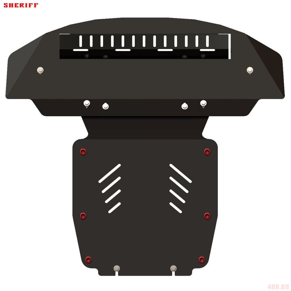 Защита картера Sheriff нужна для сохранности узлов и агрегатов, находящихся на днище авто. Она надежно защитит двигательный отсек вашей машины от повреждений. Также она защищает моторный отсек от влаги, грязи, и предусматривает наличие металлических крыльев, которые выполняют функцию пыльника.