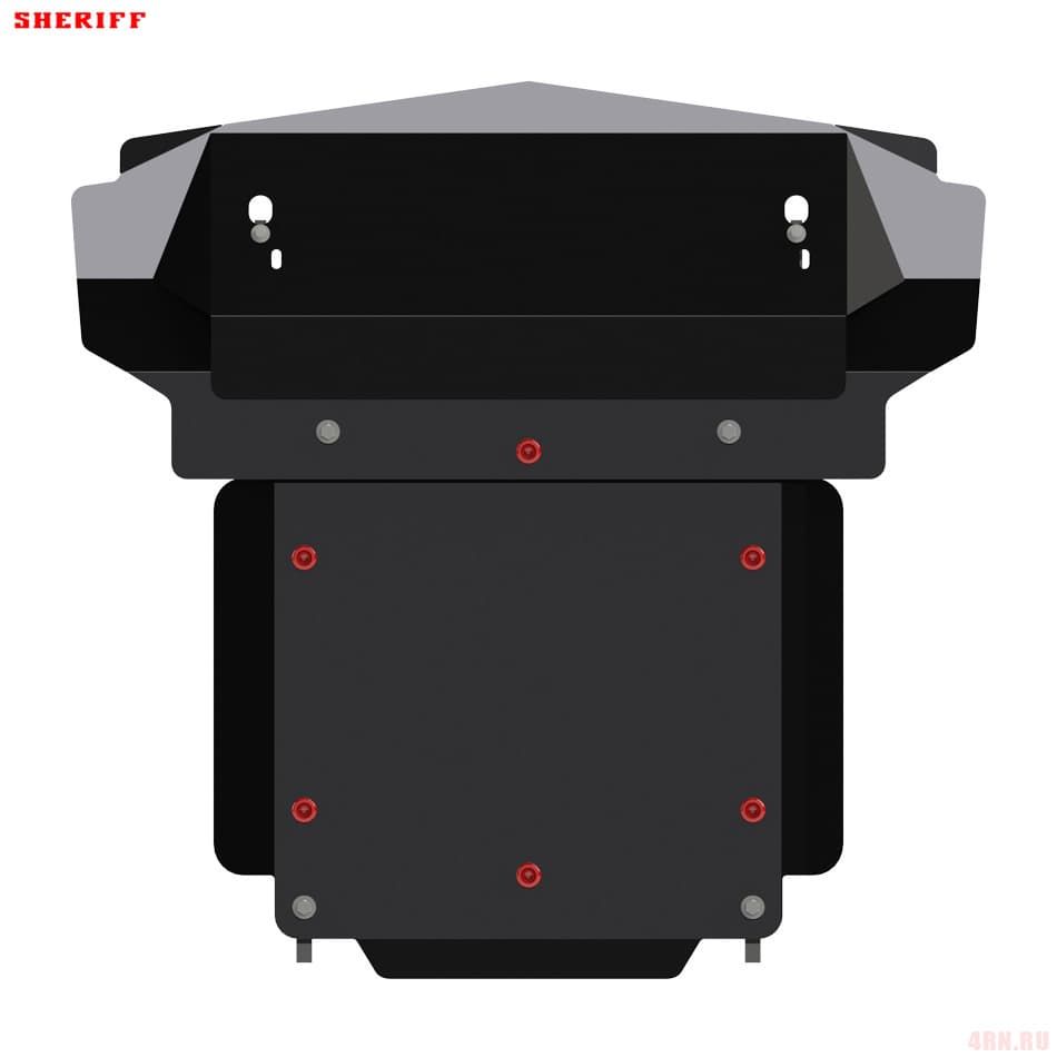 Защита картера Sheriff нужна для сохранности узлов и агрегатов, находящихся на днище авто. Она надежно защитит двигательный отсек вашей машины от повреждений. Также она защищает моторный отсек от влаги, грязи, и предусматривает наличие металлических крыльев, которые выполняют функцию пыльника.