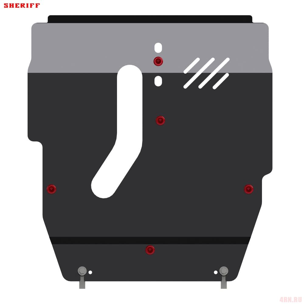 Защита картера Sheriff нужна для сохранности узлов и агрегатов, находящихся на днище авто. Она надежно защитит двигательный отсек вашей машины от повреждений. Также она защищает моторный отсек от влаги, грязи, и предусматривает наличие металлических крыльев, которые выполняют функцию пыльника.