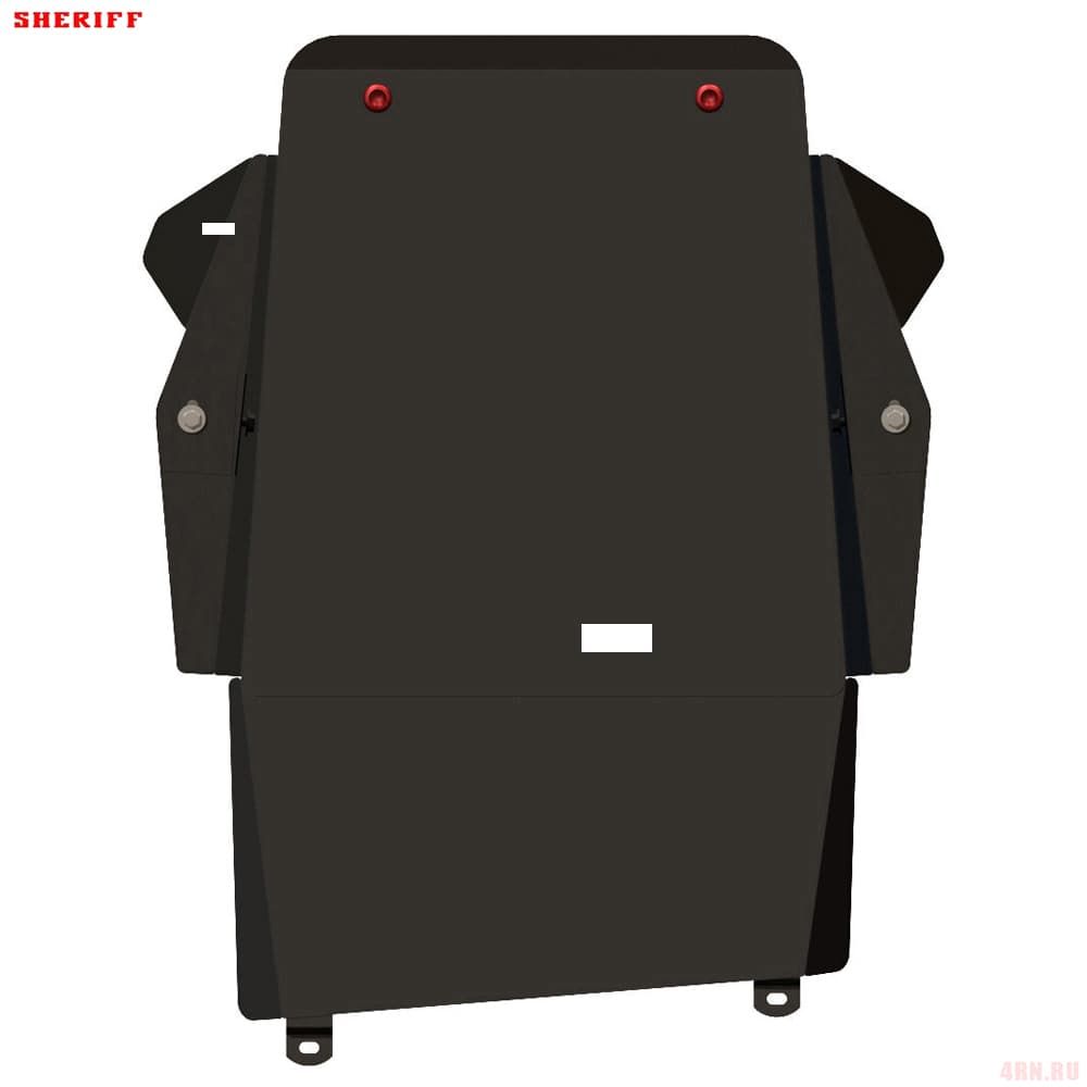 Защита картера Sheriff нужна для сохранности узлов и агрегатов, находящихся на днище авто. Она надежно защитит двигательный отсек вашей машины от повреждений. Также она защищает моторный отсек от влаги, грязи, и предусматривает наличие металлических крыльев, которые выполняют функцию пыльника.